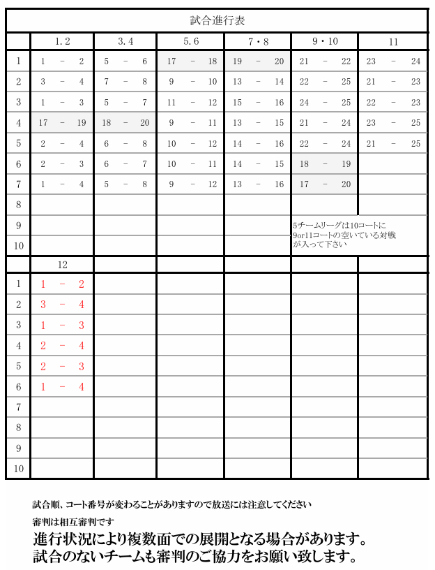 試合進行をスムーズに行うため、必ず各チーム代表者の方は本部付近にて進行案内に注意いただき、コート待機をお願いいたします。